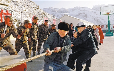 2月5日,新疆军区某边防团契恰尔边防连官兵与驻地牧民进行拔河比赛,共庆新春。
