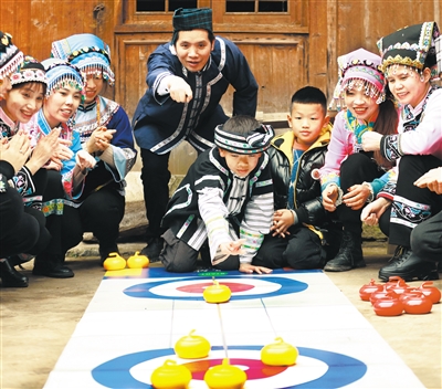 2月5日,贵州省黔西市钟山镇猫山布依村寨开展“趣味运动 助力冬奥”主题活动,旱地冰壶、扭扁担、掰手腕等趣味项目比赛,使新春佳节充满活力。