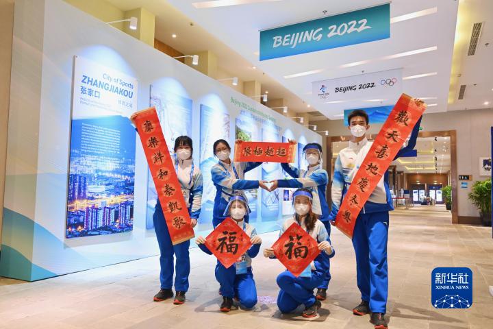 北京冬奥会张家口赛区的志愿者在山地新闻中心张贴春联,营造浓浓的中国年味迎接冬奥会。新华社记者 姜克红 摄