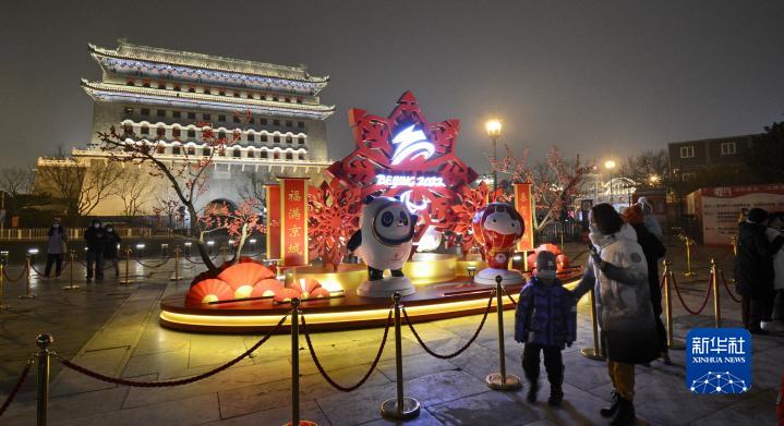 过年期间,北京市民在前门大街观赏春节和冬奥主题景观灯。新华社记者 李欣 摄