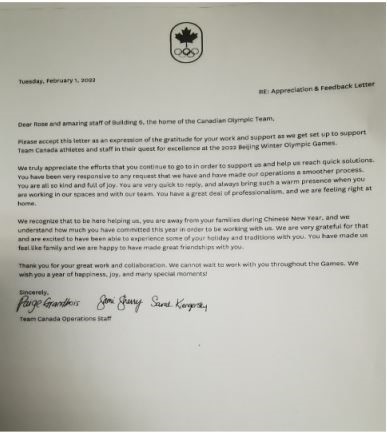 请收下这封信,以表达我们对您的工作,以及对你们支持加拿大队的运动员和工作人员在2022年北京冬奥会上追求卓越的谢意。