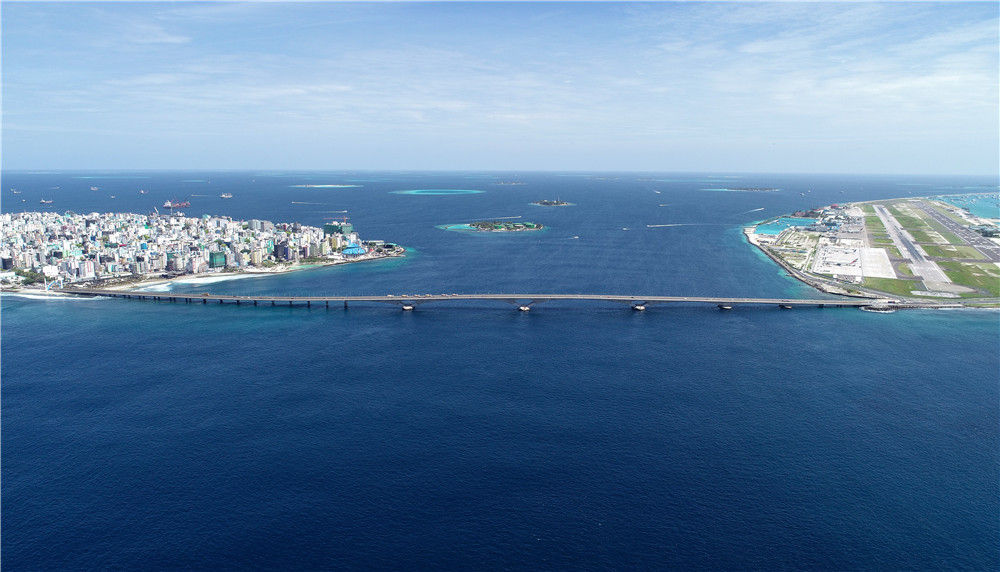 这是2019年8月30日在马尔代夫航拍的连接首都马累和机场岛的中马友谊大桥。新华社发(王明亮摄)