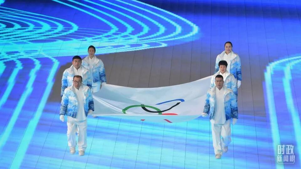 △北京冬奥会开幕式上,6名旗手手执奥林匹克会旗入场。(总台记者廖江衡拍摄)