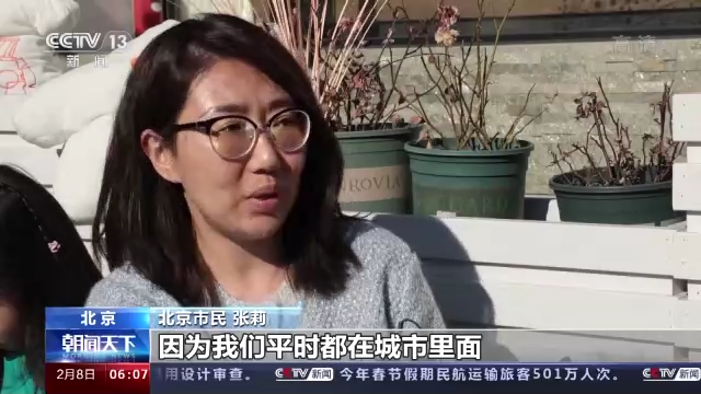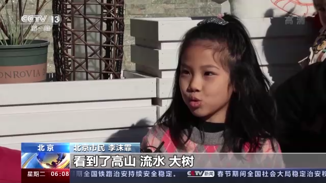 北京市民 李沫霏:看到了高山、流水、大树,在家里只有爸爸、妈妈、爷爷、奶奶和妹妹陪我过年,在这有大家一起过年了,人多了,更有那种开心的感觉。