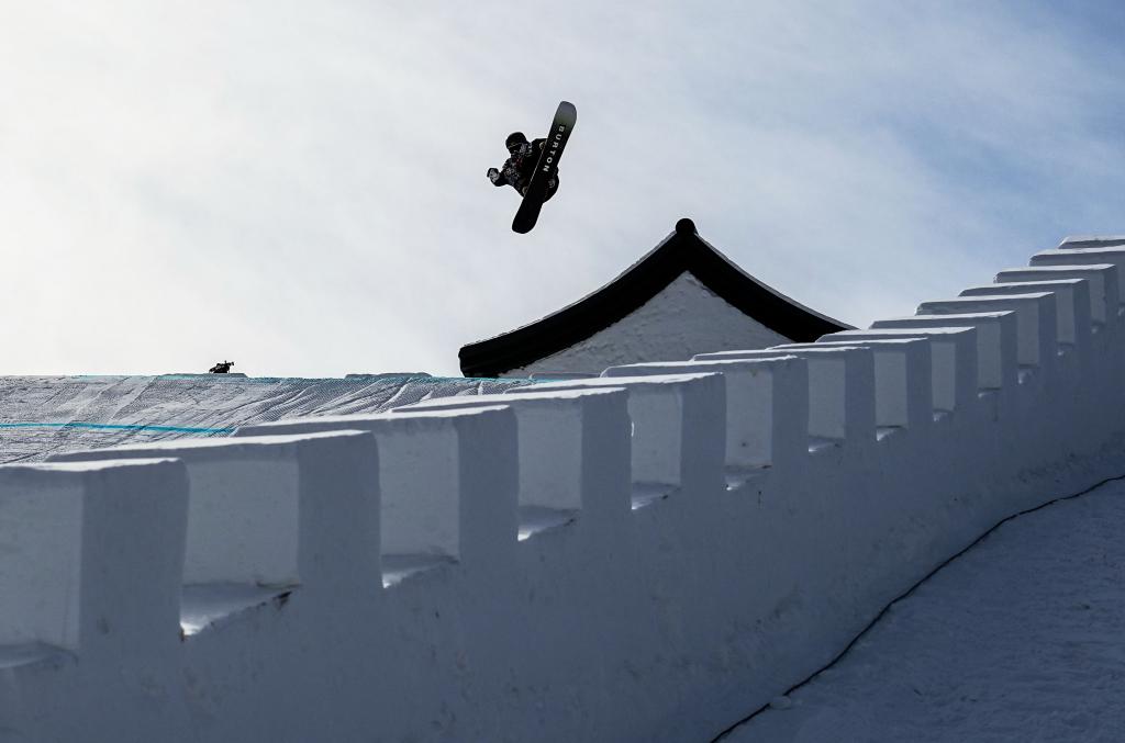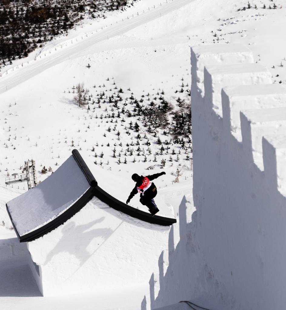 在单板滑雪坡面障碍技巧首度被引入的2014年索契冬奥会上,选手们飞跃的是俄罗斯套娃。此番在北京,当单板好手们到达云顶时,他们惊喜地发现,等待他们的是冰雪打造而成的壮观城墙与烽火台。