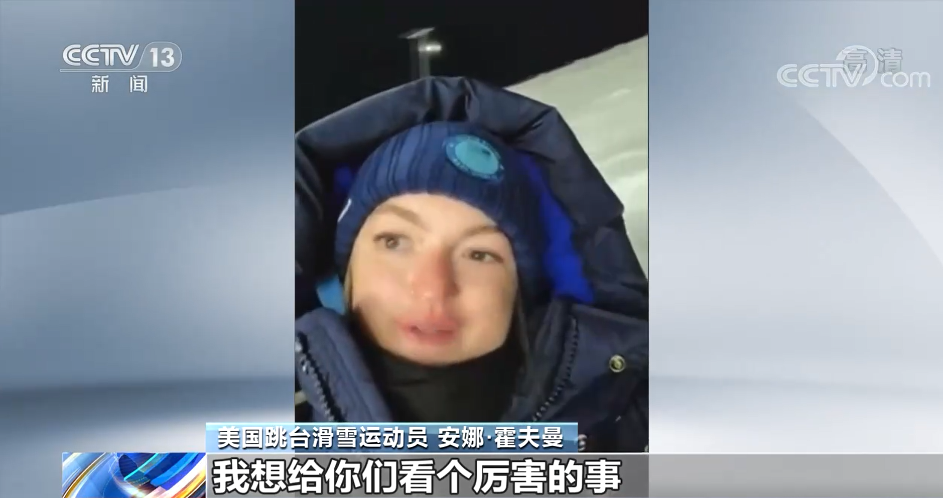 美国跳台滑雪运动员 安娜·霍夫曼:大家好!我现在在张家口,我想给你们看个厉害的事。这是一个跳台,你可以看到这边山脊上的灯带,这其实是长城!