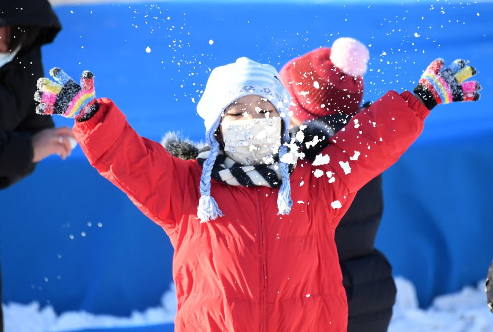 一名小朋友在北京世界公园玩雪(2021年12月16日摄)。新华社记者 任超 摄