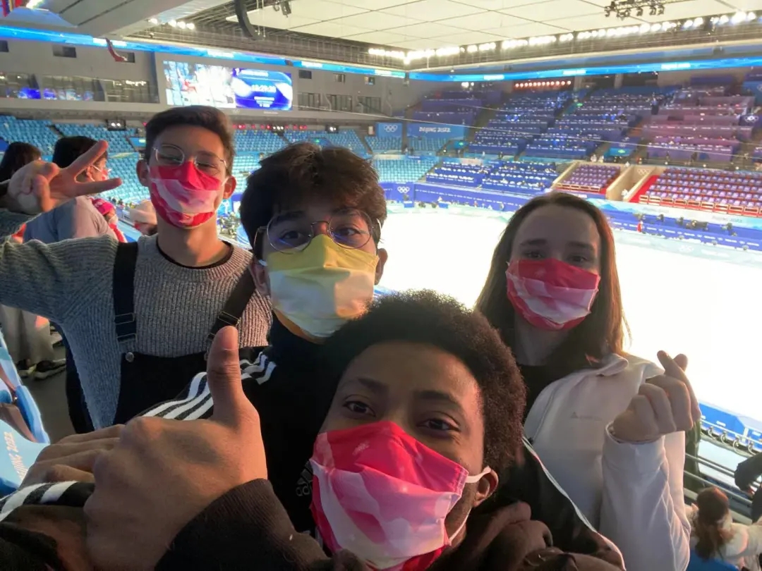 “北京2022年冬奥会已经开始了,有幸观看了精彩的开幕式之后,我们再次获得了非常珍贵的去观看花样滑冰比赛的机会。我从小就爱看花样滑冰比赛,但在电视上看的感受和在现场看非常不同。在比赛中我见到了之前只能在电视上见到的运动员,这让我很开心。他们的表现都淋漓尽致,最有趣的是后面总有可能会出现更好的队伍,这样的期待让人内心澎湃。现场在宣布成绩的时候会故意拖延时间,让观众非常激动和紧张。此外,运动员表演时的配乐也都非常好听。在体育场还会有机会在大屏幕上看到自己,看到其他国家的观众,他们都为自己国家的运动员加油。最后我还发现了有很多来自不同地区的志愿者向我们挥手,他们非常辛苦,我们十分感激。”