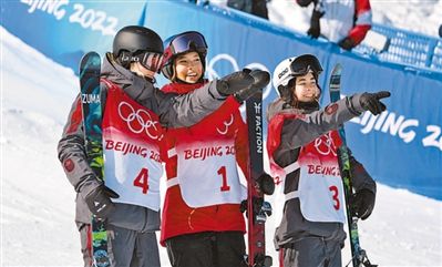 2月18日,自由式滑雪女子U型场地技巧决赛后,获得冠军的中国队选手谷爱凌(中)和获得亚军的加拿大队选手凯茜·夏普(左)、获得季军的加拿大队选手蕾切尔·卡克愉快地交流。