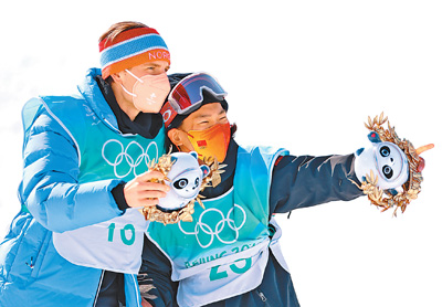 2月15日,单板滑雪男子大跳台决赛后,冠军获得者中国队选手苏翊鸣(右)和亚军获得者挪威队选手蒙斯·勒伊斯韦兰在颁发纪念品仪式上合影留念。