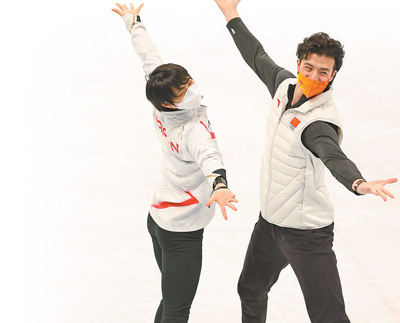 2月19日,在首都体育馆,中国队花样滑冰选手柳鑫宇(右)与日本队花样滑冰选手羽生结弦一同练习,为20日进行的表演滑做准备。