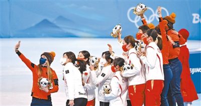 2月13日,短道速滑女子3000米接力决赛后,冠军荷兰队选手、亚军韩国队选手与季军中国队选手在颁发纪念品仪式上合影。