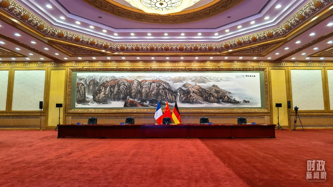 △视频峰会现场摆放的中法德三国国旗。(总台央视记者范一鸣拍摄)
