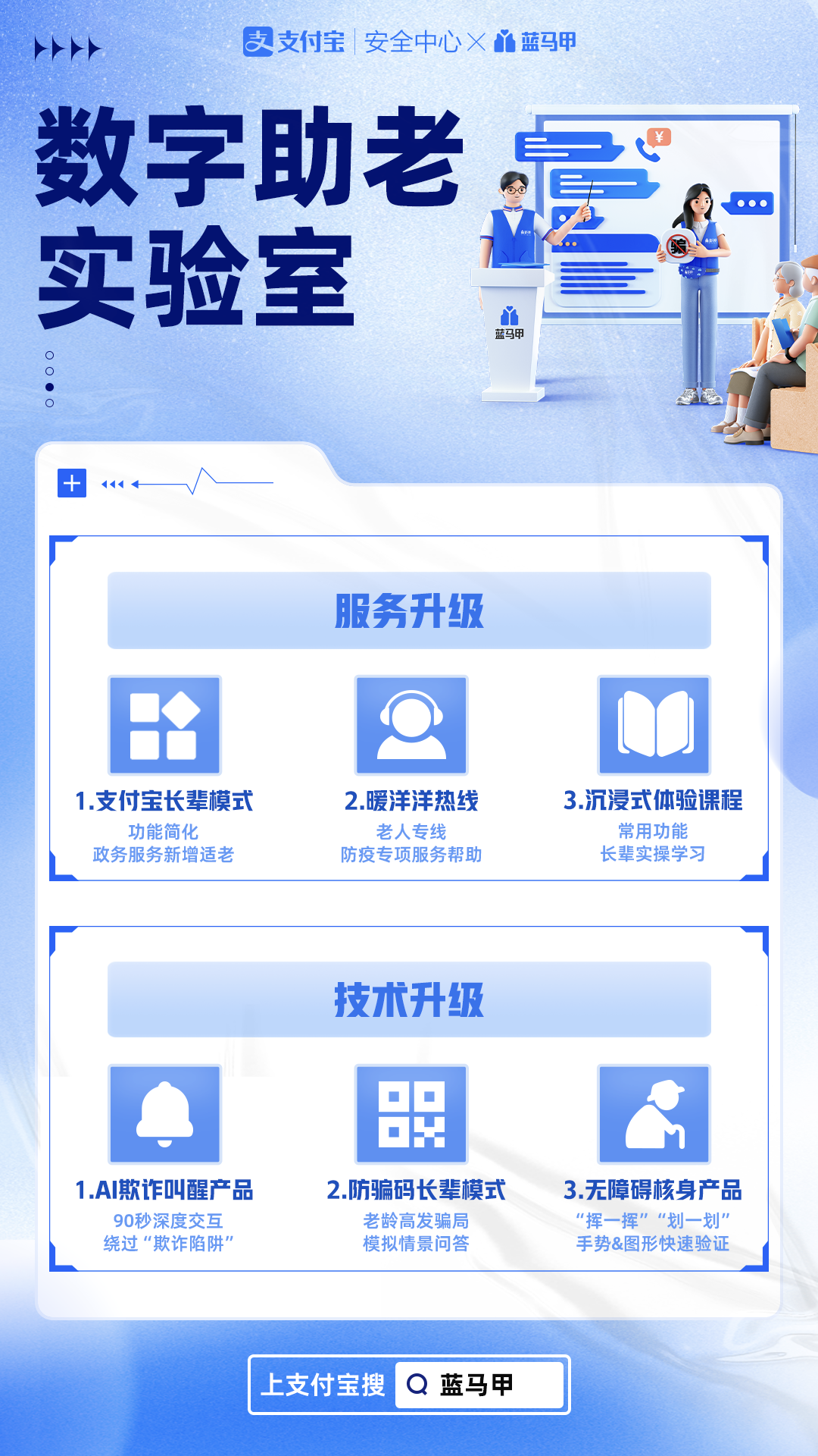 蓝马甲数字助老实验室首次亮相,携六大助老服务参会。通过技术升级降低老年人使用智能手机门槛,陆续推出升级版AI欺诈叫醒产品、防骗码长辈模式、无障碍核身产品等功能;服务升级提升使用体验,通过不断优化支付宝长辈模式、暖洋洋热线、沉浸式体验课程,助力老人共享数字新生活。