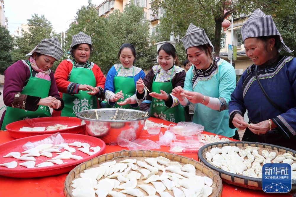 1月17日,群众在贵州省黔东南苗族侗族自治州榕江县车民街道富民移民安置区迎新年活动中包饺子。新华社发(李长华摄)
