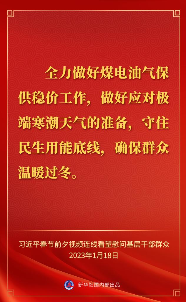 春节即将到来之际,中共中央总书记、国家主席、中央军委主席习近平通过视频连线看望慰问基层干部群众,向全国各族人民致以新春的美好祝福,祝各族人民身体健康、阖家幸福、事业进步、兔年吉祥!祝愿伟大祖国繁荣昌盛、国泰民安!