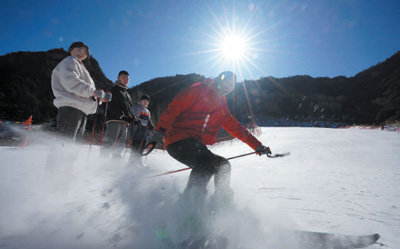 黑崖沟村开设了高山滑雪场,教练为孩子们示范滑雪动作。