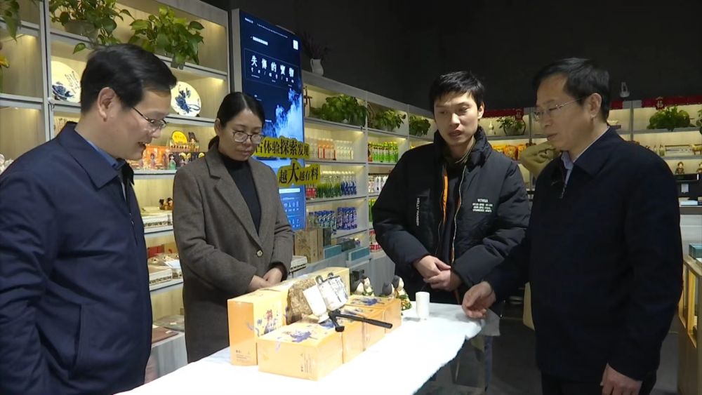 2022年2月,马萧林(右一)在洛阳调研博物馆文创发展。受访者供图