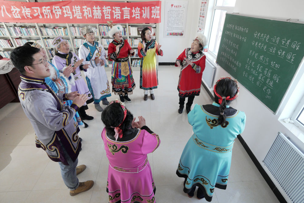 黑龙江省同江市八岔赫哲族乡八岔村伊玛堪传习所内,阵阵歌声婉转悠扬。正逢伊玛堪教学日,38岁的刘蕾身着民族传统服饰,和村民唱起《乌苏里船歌》。