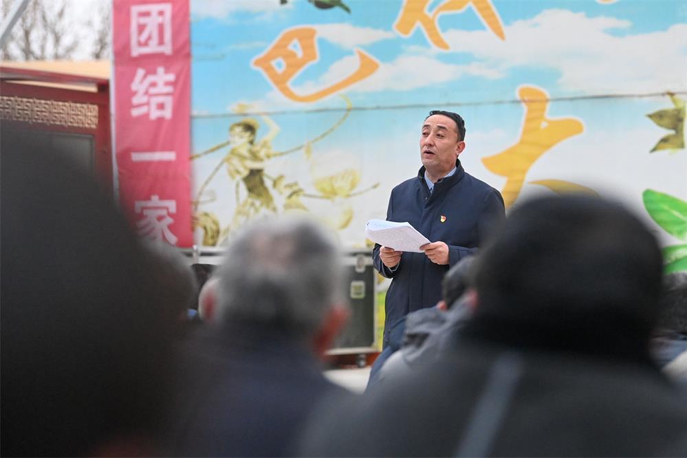 2月20日,在新疆和田地区策勒县巴什玉吉买村村委会,买买提依布热依木·买买提明在升旗仪式后为村民宣讲惠民政策。新华社记者 丁磊 摄