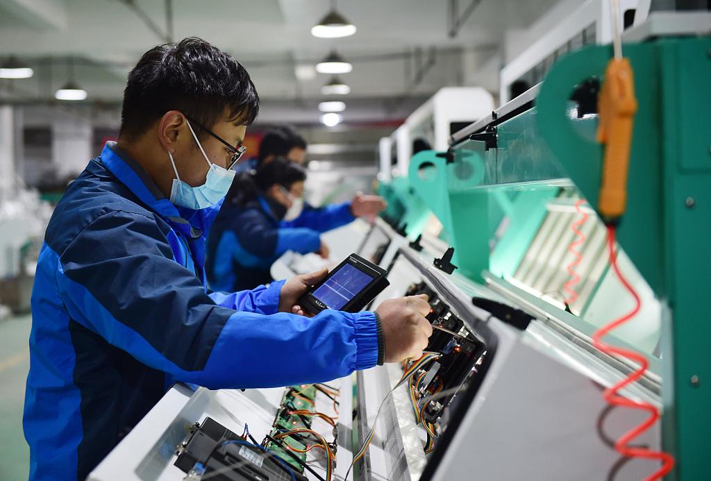 2022年12月29日,合肥,瑶海区的长三角数字科技示范园内,工人在调试出口到海外的CCD智能色选机。视觉中国 资料图