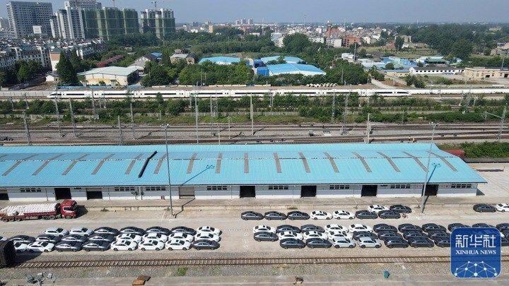 这是位于合肥市长丰县的铁路水家湖货运站等待装车外运的新能源汽车(5月9日,无人机照片)。新华社记者 刘军喜 摄