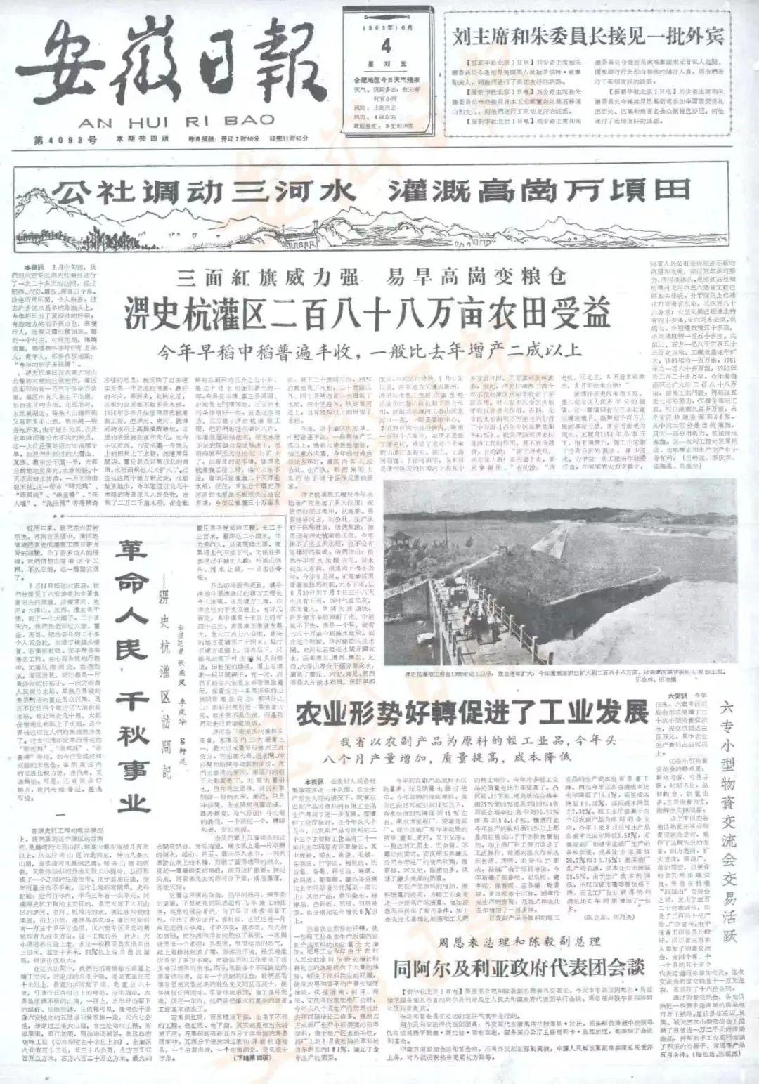 1963年10月4日的《安徽日报》在1版大篇幅报道了淠史杭工程带来的效益,其中,张燕风等记者采写的《革命人民 千秋事业》通讯中写道:“淠史杭工程还未完成,正在继续施工。它虽已给皖西人民带来了莫大的好处,但真正的幸福还在前头。”