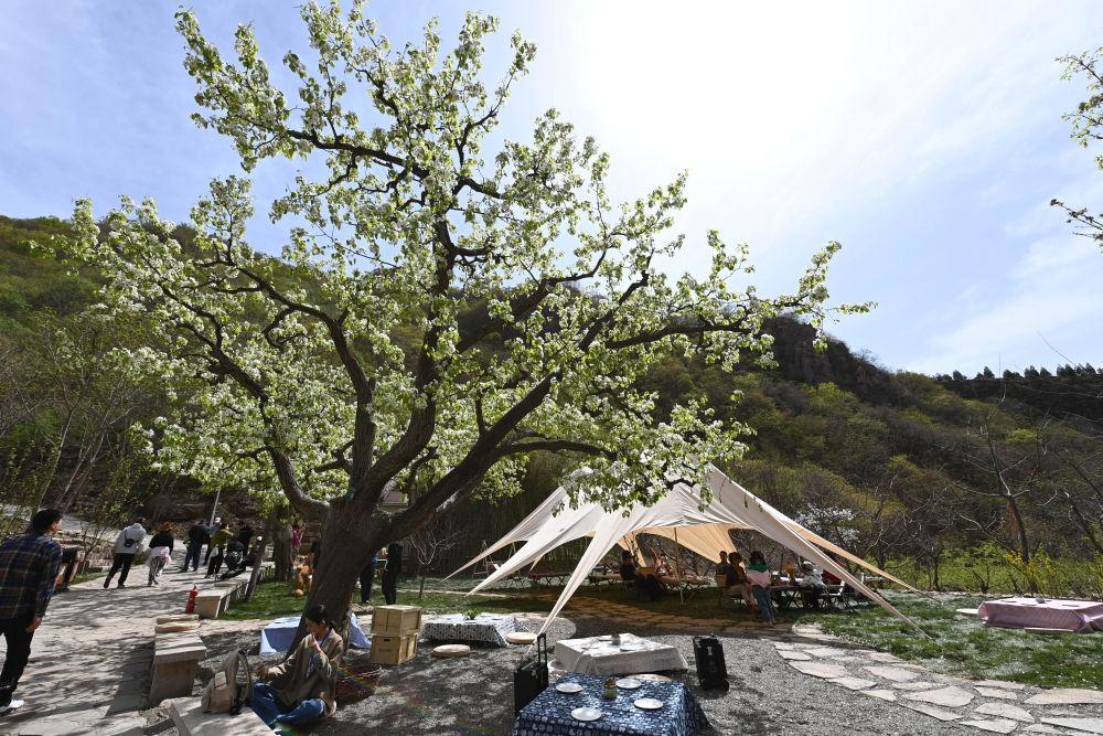 4月15日,游客在天津市蓟州区梨木台景区内游玩。新华社记者 赵子硕 摄