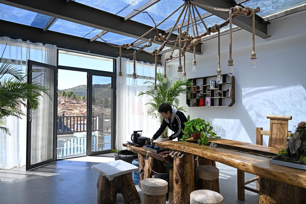 4月7日,天津市蓟州区罗庄子镇一家民宿的负责人在整理茶具。新华社记者 赵子硕 摄