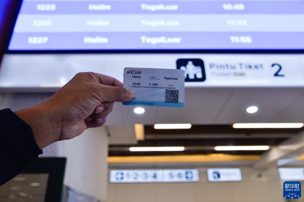 8月31日,在印度尼西亚雅加达雅万高铁哈利姆高铁站,一名工作人员展示雅万高铁样票。新华社记者 徐钦 摄