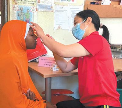 8月27日,中国(江苏)第三十二期援桑给巴尔医疗队眼科医生董莉莉(右)在坦桑尼亚桑给巴尔岛为当地患者检查。