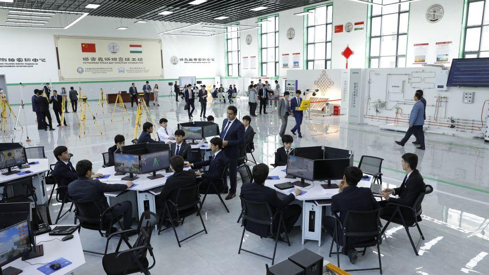 ↑学生们在塔吉克斯坦首都杜尚别的鲁班工坊内学习与实践(2023年4月12日摄)。