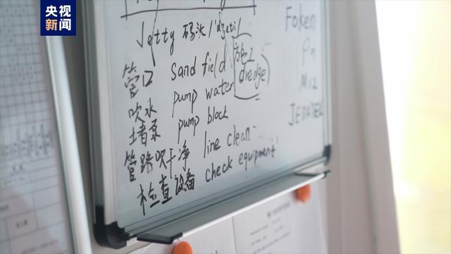 中国港湾阿布扎比项目部“天鲲号”水手 陈佳俊:Pump,我们的泵。Pump Water,表示吹水。Pump Block,就是堵泵了。在国内用不到英语,都是在这边跟外国人沟通才用到的。通过施工、日常交流用语学到了这些词,也慢慢变得敢开口敢说,能进行一些简单的沟通。