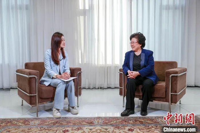 中国国际经济交流中心总经济师、执行局副主任、学术委员会副主任陈文玲(右)接受中新社“中国焦点面对面”采访。中新社记者 贾天勇 摄
