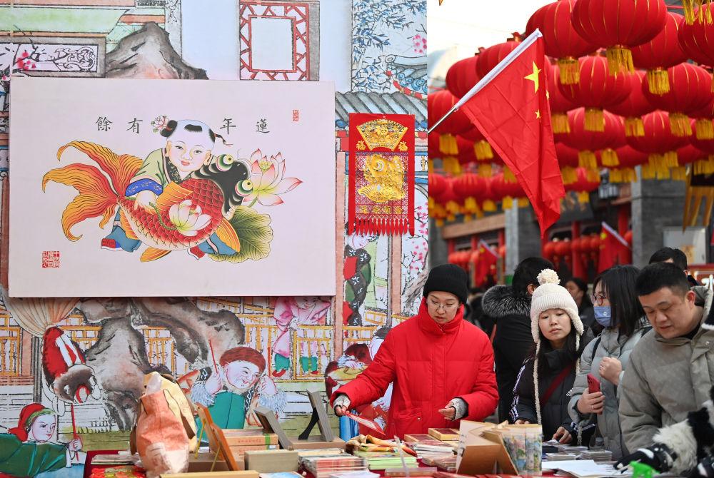 近日,在天津古文化街,游客在选购天津杨柳青年画。新华社记者 李然 摄