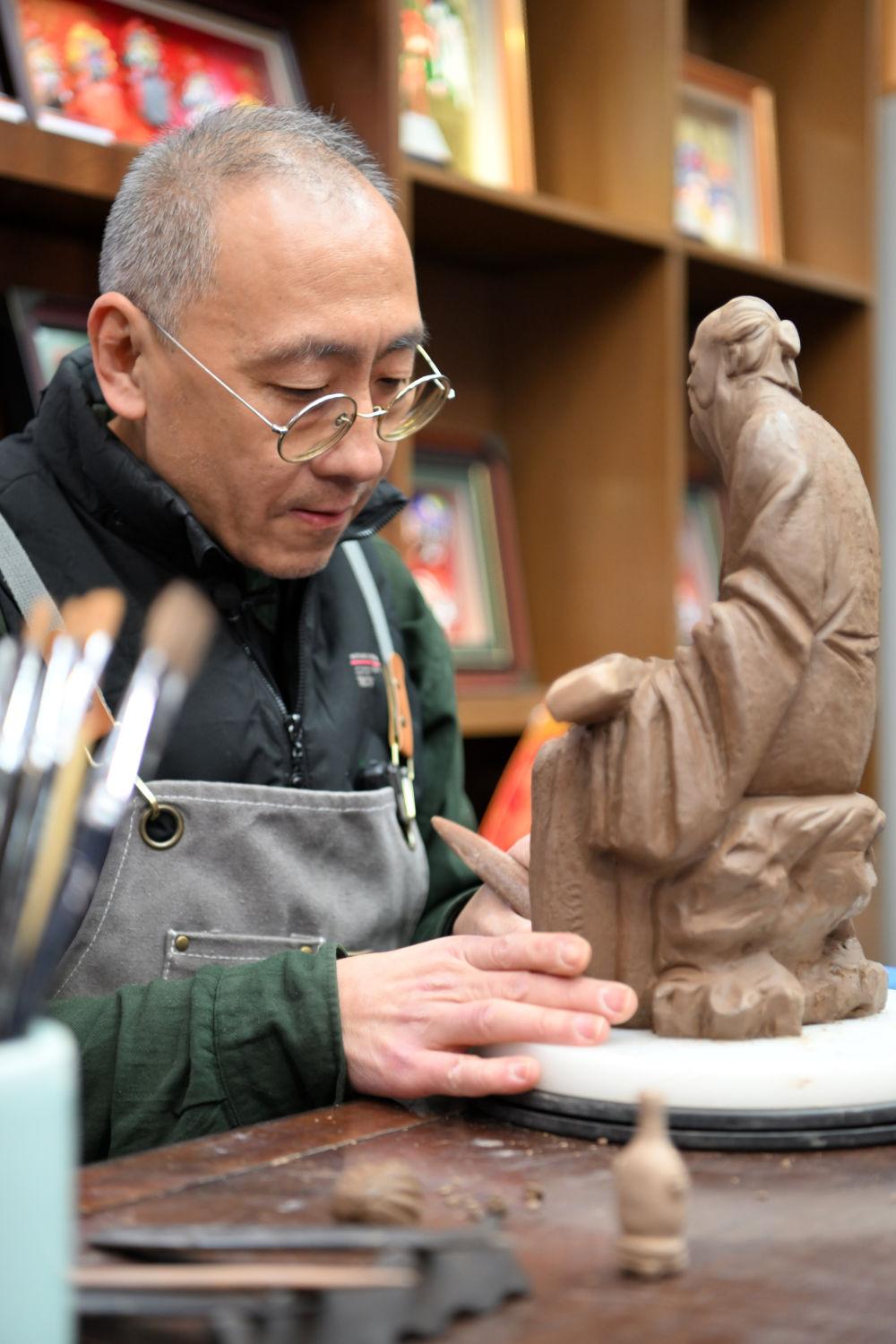 近日,在天津古文化街,泥人张制作部的老师傅刘强在店内工作。新华社记者 李然 摄