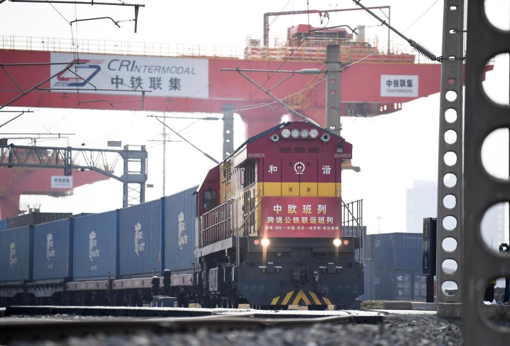 3月7日,中欧班列(越南·河内——中国·西安——匈牙利·布达佩斯)跨境公铁联运班列从西安国际港站驶出。新华社记者李一博摄