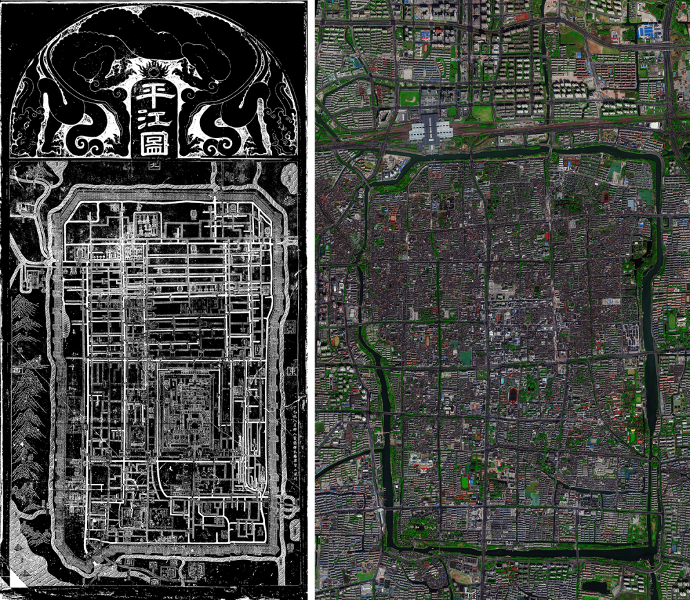 拼版照片:左图为宋代碑刻《平江图》(资料照片);右图为2023年3月拍摄的苏州古城的卫星图像。新华社发