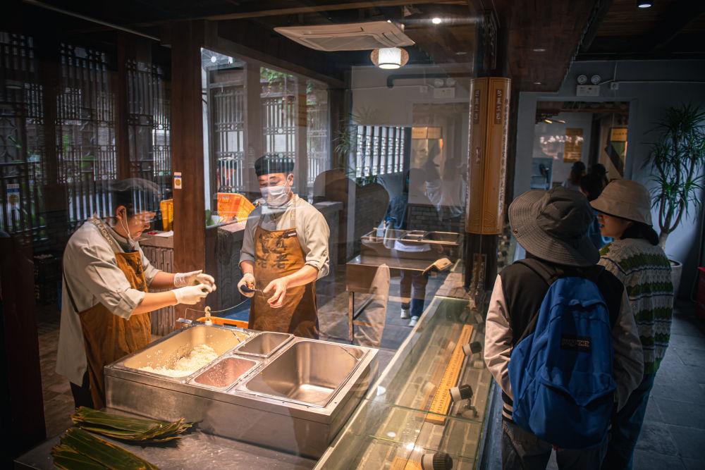 4月26日,游客在嘉兴市月河历史街区嘉兴粽子文化博物馆参观粽子制作过程。新华社记者 江汉 摄