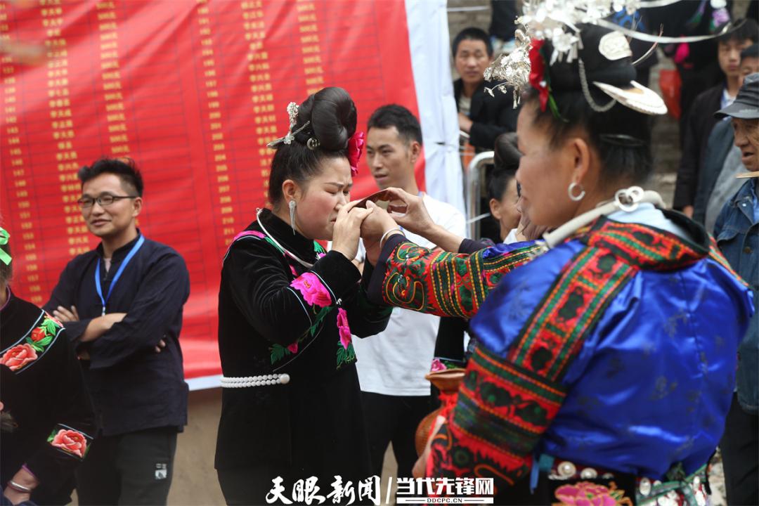 苗族群众在鼓藏宴上端起酒碗。