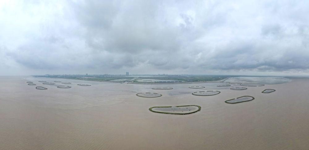 俯瞰上海临港新片区滨海区域,一个个形状如同开口贝壳的大型牡蛎礁在潮涨潮落中隐现,各类海鸟不时飞过,滩涂上生长着茂密的芦苇,海三棱藨草等本地植物也随处可见。