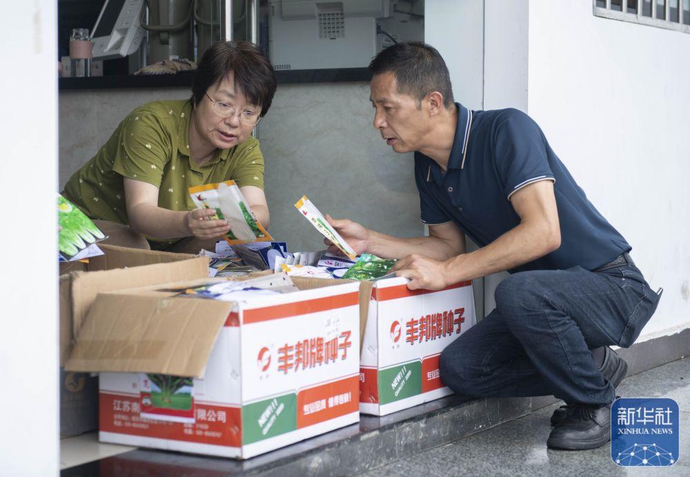 6月28日,在黄山市屯溪区奕棋镇徐村,屯溪区农业农村局工作人员方晓静(左)为徐村党支部书记钟朝晖介绍区农业农村局向徐村发放的种子。新华社记者 傅天 摄