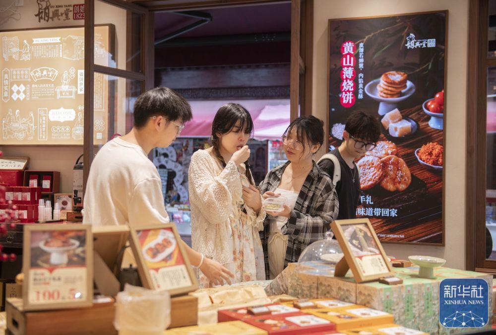 6月28日,在位于黄山市屯溪区的中国历史文化名街屯溪老街,游客在一家店铺试吃黄山特色小吃。新华社记者 傅天 摄