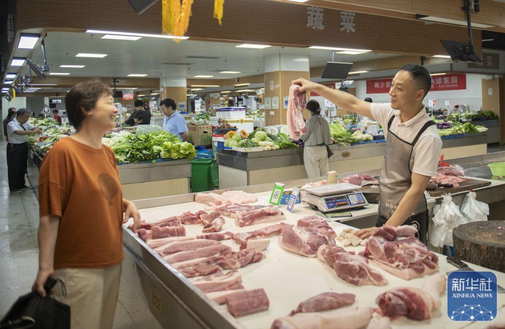 6月28日,在黄山市屯溪区阜上邻里中心菜市场,商户向顾客展示猪肉。