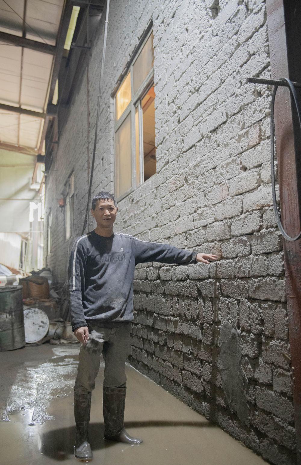 6月27日,在安徽省黄山市休宁县东临溪镇临溪村,金童水泥有限公司工作人员用手示意积水曾经到达的高度。新华社记者傅天 摄