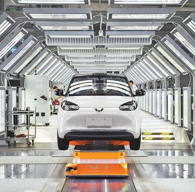 广西壮族自治区柳州市上汽通用五菱精益智造工厂内,整车正等待下线。