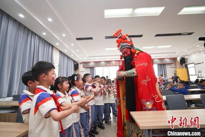 2023年6月26日,山西太原,小学生们与戏曲人物关公互动。当日,山西省武凌云晋剧名家工作室的艺术家们走进太原新建路小学校,将传统戏曲引进课堂,让学生们感受戏曲的魅力。 中新社记者 张云 摄