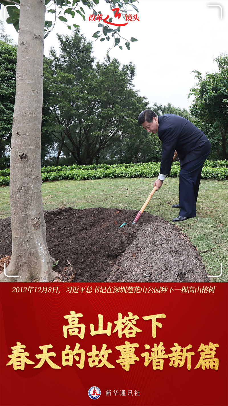 深圳莲花山,一棵迎风而立的高山榕,挺拔茂盛。树前一方花岗石碑上,镌刻着“习近平手植树”。