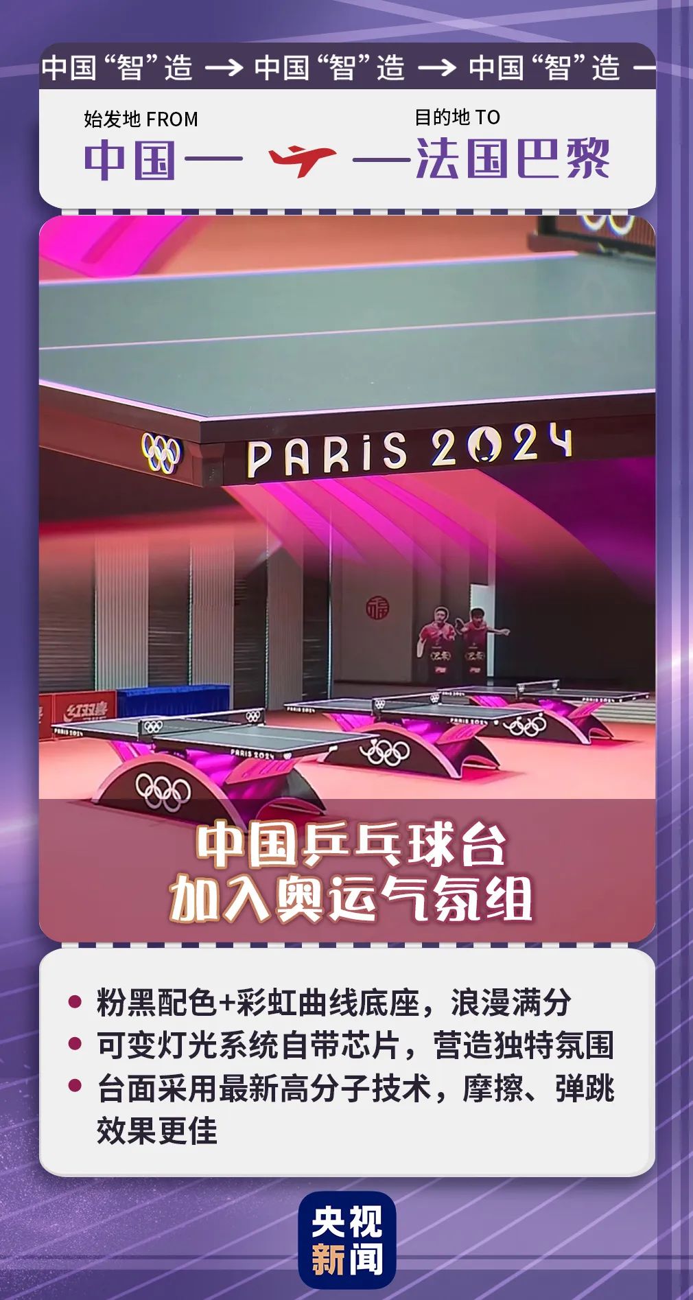 这次巴黎奥运会的乒乓球球桌是由中国“智”造的,是粉、黑色,搭配彩色的曲线底座,期待这样浪漫的氛围加上浪漫的巴黎,会有怎么样的碰撞!