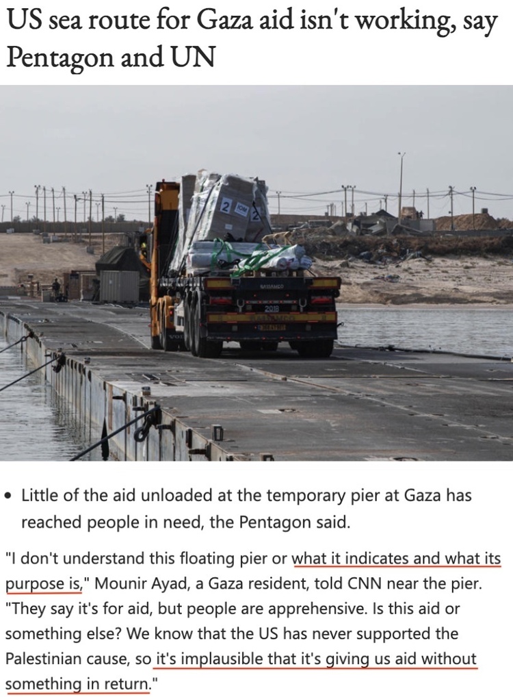 加沙居民穆尼尔·阿亚德就曾对美国媒体表示,他不明白这个临时码头意味着什么,目的又是什么。